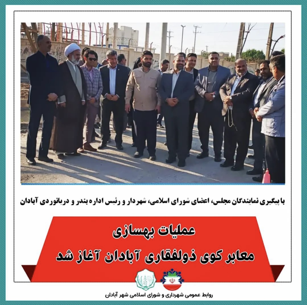عملیات روكش آسفالت و بهسازی معابر اصلی چهل متری ذوالفقاری آبادان با حضور نمایندگان مجلس، اعضاي شورای اسلامی شهر، شهردار، رئیس اداره بنادر و دريانوردي و سایر مسئولین شهرستان با اعتباري بالغ بر ٢٢٥ میلیارد ریال آغاز شد.